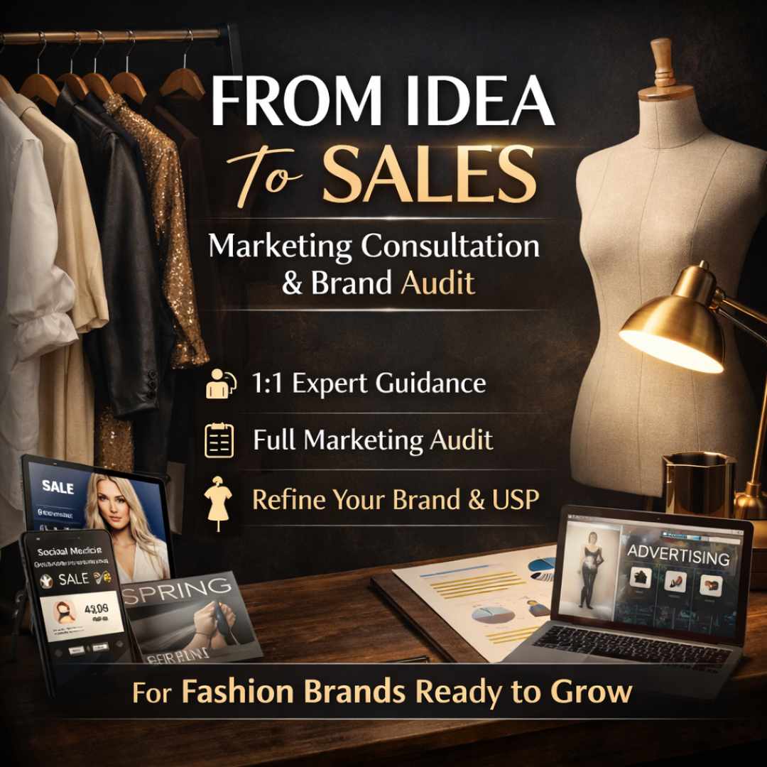 From Idea To Sales Marketing Consultation and Brand Audit is designed especially for fashion brands that feel stuck in their marketing journey. Whether you are an emerging label trying to make your mark or an established brand struggling with stagnant growth, this consultation helps you understand what is working, what is missing, and what needs to change to move your brand forward with more confidence and direction.